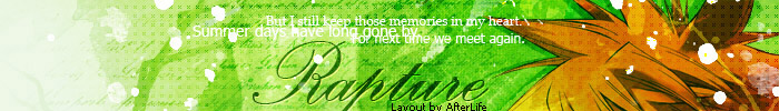 Rapture: This layout was meant to be just another normal pre-made design that you can find at AfterLife but I saw the layout contest over at Celestial Star and got really exicited about entering. So, i'll be entering this layout and one other. About this layout a bit is that I was hoping to make one of my best layouts ever and when you try to make something good it usally doesn't turn out very good in the end. I made four layouts just like this one before I made and stayed with this one. This one is small in size and uses very nice shades of lime green. I thought the contrast was pretty good too.
